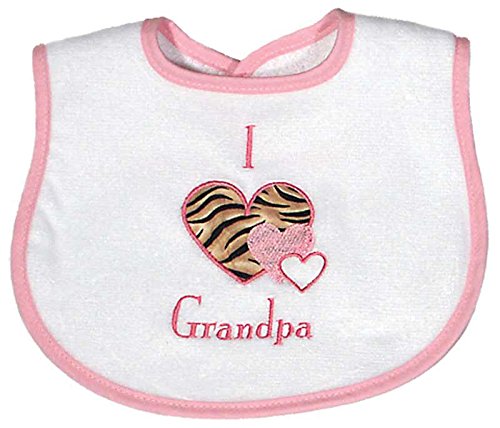For the modern baby girl, this appliqued animal skin, print heart will warm all the hearts who see it. Raindrops has embroidered it with an, "I heart Grandpa" honoring a most important person, Grandpa. It is made from the best 100% cotton velour terry and will absorb all the messes your little one can create. There is no polyester in any of our velour terry, only cotton, and because of this, this top quality bib will absorb all liquids and continue to wear and wash beautifully. This bib can be added to almost any baby fashionista outfit or gift. The pink binding makes it a girl bib, but it is available in a Grandma version, too. Raindrops has been manufacturing top quality, unique baby garments in the USA, since 1936.