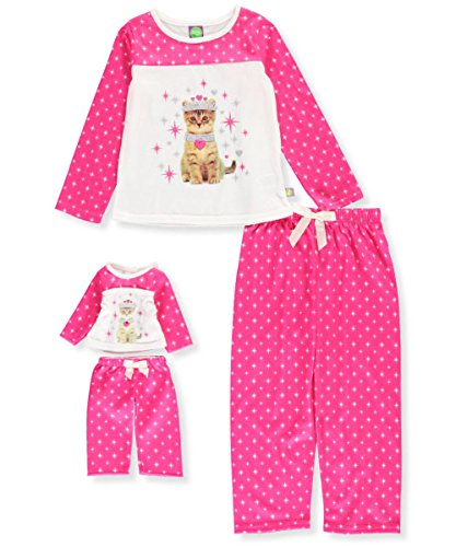 2 piece set: long sleeve sleepwear top with ruffle details and dog screen print. Snowflake printed pajama bottoms with ruffled hem. Comes with matching doll garment.