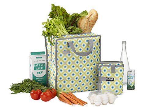 This soft sided Freezable Reusable Grocery bag is made from nontoxic poly canvas and has a food-safe, water-resistant lining. Like all PackIt products, the Grocery Bag is made from PVC-, BPA-, phthalate-, formaldehyde- and lead-free materials. Care: interior wipes clean, spot clean exterior