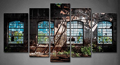 -. Title : 5 Panel Wall Art Abandoned Industrial Interior With Bright Light Ruin Window Plant Painting The Picture P.R.Int On Canvas Architecture Pictures For Home Decor Decoration Gift piece (Stretched By Wooden Frame,Ready To Hang)