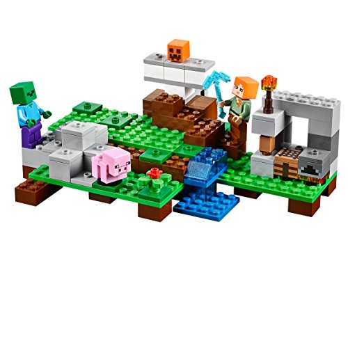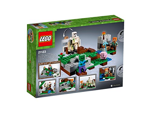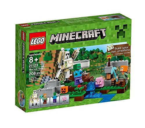 -. Feature : Enthält 2 Minifiguren: Alex und einen Zombie sowie einen Eisengolem und ein Ferkel. / Benutze die geheime Popup-Funktion, um den Zombie überraschend mit dem Eisengolem anzugreifen! / Grabe mit deiner Diamantspitzhacke nach Eisenerz, schmelze das Eisenerz im Schmelzofen ein und benutze dann den Crafting-Tisch, um Eisenblöcke zu erzeugen. / Staple die Blöcke übereinander und setz ganz oben den Kürbiskopf auf, um den Eisengolem zu erschaffen. / Zubehör: eine baubare Fackel und ein Kürbis.