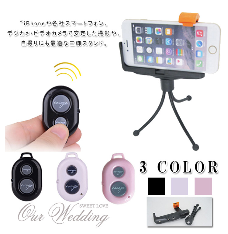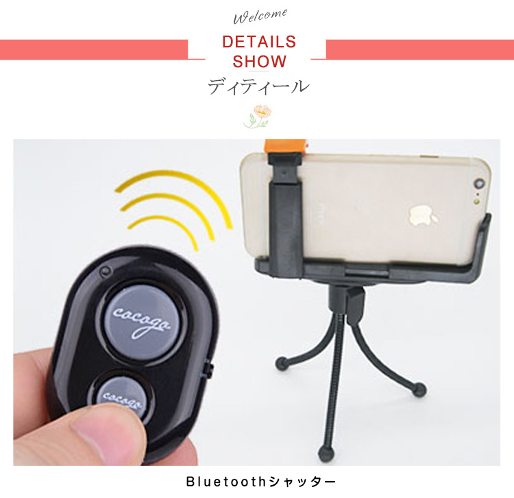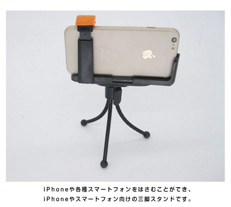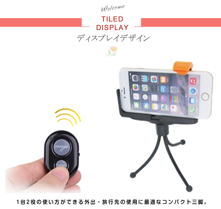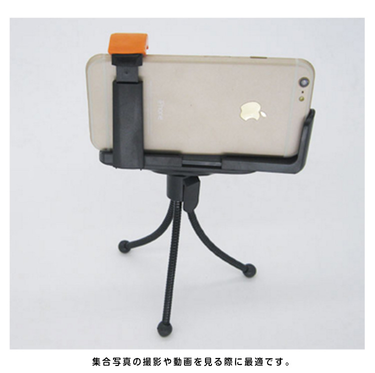 | iPhoneや各社スマートフォンで安定した撮影や、自撮りにも最適な三脚スタンド。コンパクトに折りたためるので、旅行などに出かける際も荷物の邪魔にならず手軽に持ち運べます。集合写真の撮影や動画を見る際に最適です。 | |