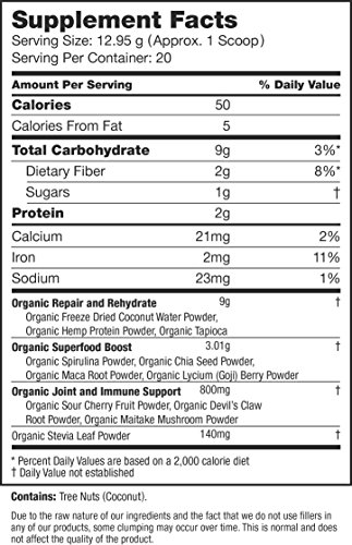 Vegan, Certified Paleo, and Non-GMO. We use only the finest ingredients in this natural post workout supplement because we believe you should put the best in your body. This unique blend features organic freeze-dried Coconut Water, organic Hemp Protein, Chia Seeds, Maca Root and organic Maitake Mushroom!