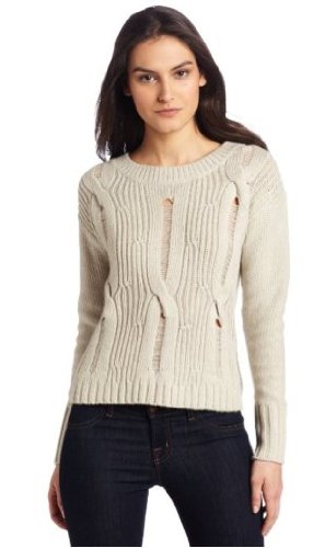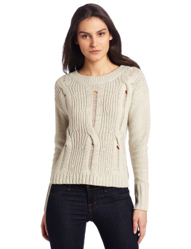 Long sleeve pullover sweater with open weave cable knit sweater detail along the front.