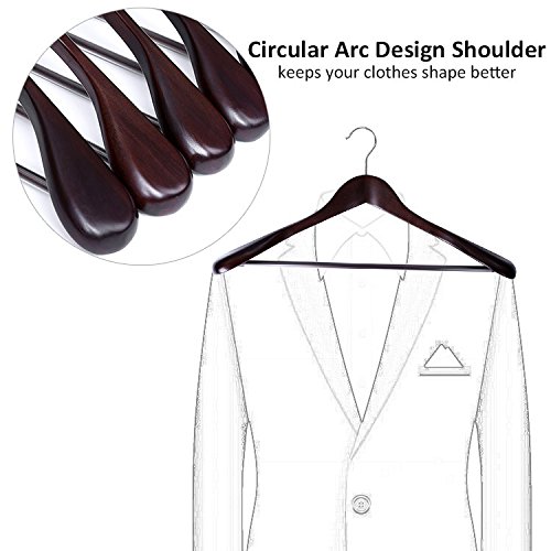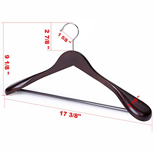 -. Feature : SOLID&DURABLE&CAPTIVATING: Made of High Grade Hardwood (Gugertree), this wooden hangers will serve you better. Smooth retro mahogany finish provides an attractive looking / HEAVY DUTY&PRACTICAL: Non-slip crossbar fixed with sturdy screws which make the hangers more firm, suitable for hanging heavy suits, coats, pants, shirts, jackets, etc. / ANTI-RUST 360° ROTATING HOOKS: Designed with premium quality hook which allows for full 360 degree swivel, simple and easy to hang / STYLISH&EXTRA WIDE SHOULDERS: Wider shoulders design prevent your clothes from slipping off and retain their original shape / DECENT SIZE: Single product size is 17 3/8"L x 2 1/8"W x 9 1/8"H, 6 packs, save more space in your closet