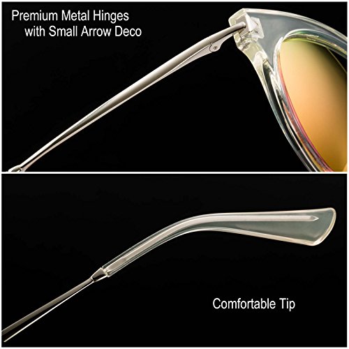 Frame The frame is made of plastic. Lenses TAC Polarized Lens- prevent UVAUVB; glare isolated, and makes your eyes feel more comfortable and see more clear; REVO film, isolates dazzle light and makes you look great and feel gorgeous. Definitely gives you one more chance to show yourself; All of our sunglasses are of UV (UVA and UVB) protection, and this is the basic characteristics of our Sunglasses.