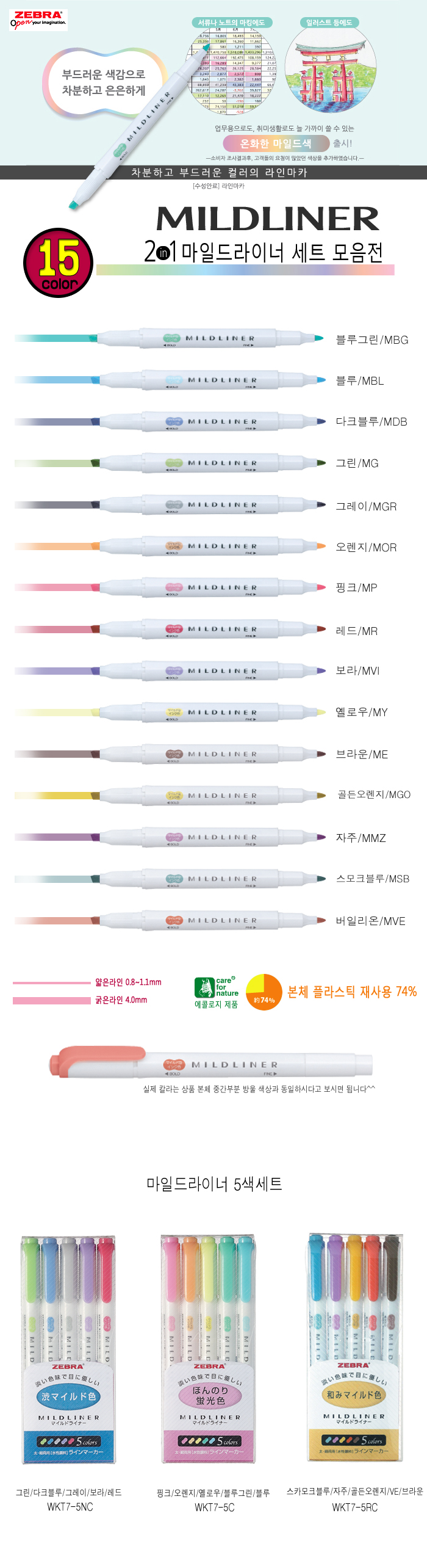 상품명 : [00032238] 마일드라이너 형광펜 5색세트 에센티소프트 MILD LINER