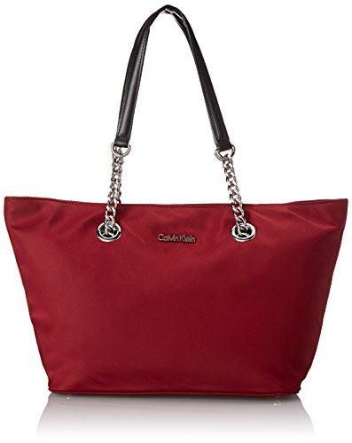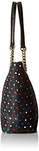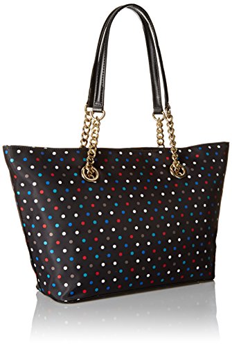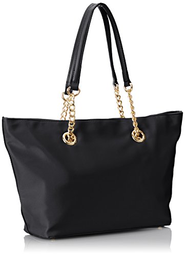 -. Feature : Wide shopper's bag featuring gold-tone feet, logo, and chain straps with leather at shoulders / Shoulder strap length: 22" / One interior back wall zipper pocket and two interior pockets