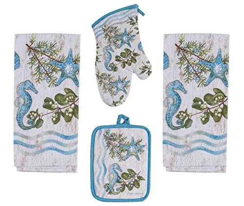 - "Ocean Tide" bundle includes 2 terrycloth towels, 1 oven mitt, and 1 potholder; all 100% cotton