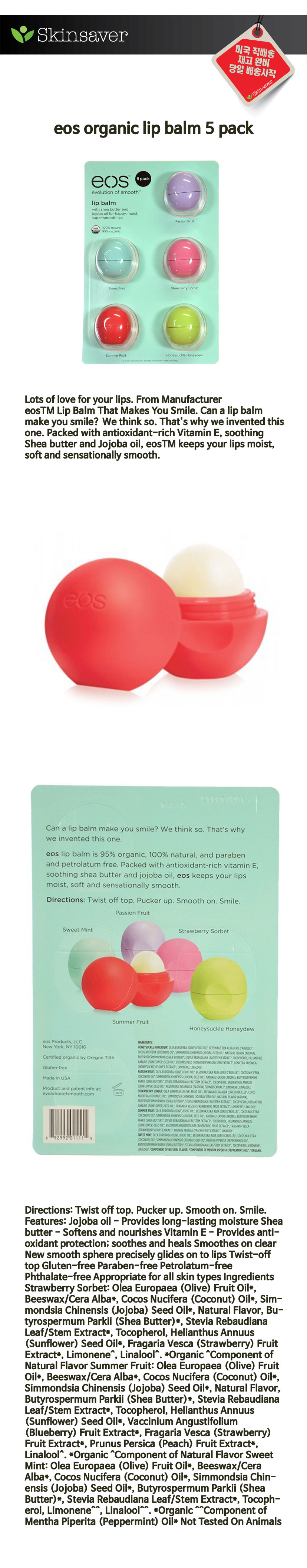 제조국 : 미국, 주요성분: 올레 Europaea (올리브) 과일 오일 (유기농), 밀랍 (유기농), 코코스 나무 & (코코넛) 오일 (유기농), Simmondsia 꽃 (호호바) 씨 오일 (유기농), 박하 나무 Piperita (페퍼민트) 오일 (유기농), 시어 버터 ( 유기농), 스테비아 Rebaudiana 잎이 / 추출 줄기 (유기)를, 토코페롤, 박하 나무 Piperita (박하의 리모넨 (구성 요소) 오일), 리 날롤 민트 (Mentha Piperita의 구성 요소 (페퍼민트) 오일)