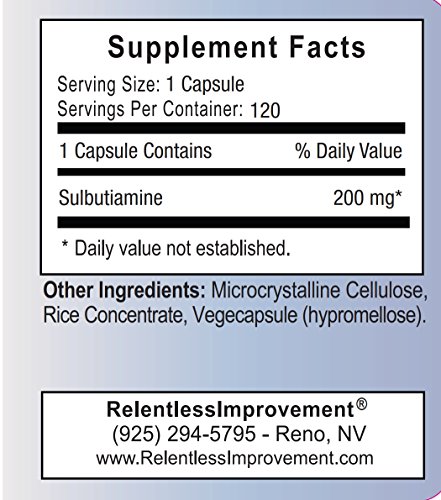 -. Binding : Health and Beauty -. Brand : Relentless Improvement -. EAN : 0854463005320 -. Feature : Manufactured in USA, FDA registered, cGMP facilities. / The effect of sulbutiamine can be described as a boost in mood, almost euphoric in some cases, comparable to a very strong coffee without the agitation and anxiety sometimes associated with caffeine -. Label : Relentless Improvement -. Manufacturer : Relentless Improvement -. ProductGroup : Health and Beauty -. ProductTypeName : HEALTH_PERSONAL_CARE -. Publisher : Relentless Improvement -. Studio : Relentless Improvement -. Title : Sulbutiamine 200mg x 120 capsules. -. UPC : 854463005320