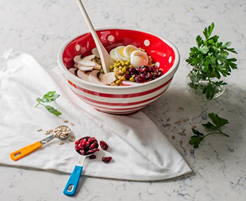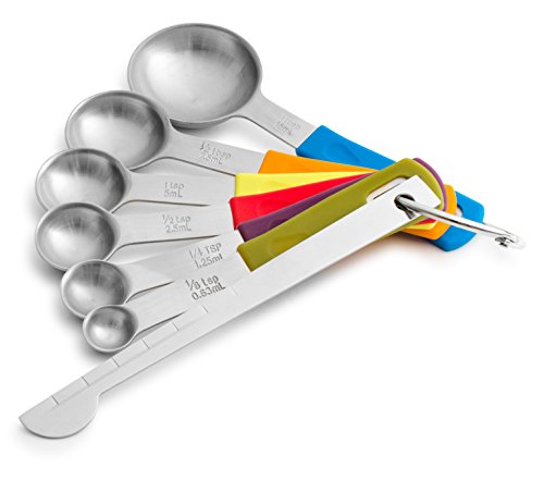 - RAINBOW COLORS: Apart from extremely useful and practical, the Measuring Spoons are also very cool and pretty! Their handles are colorful and they even help you remember the size of each Spoon! There is blue, orange, yellow, red, purple and green! Why have boring kitchen utensil when you can have these colorful ones?