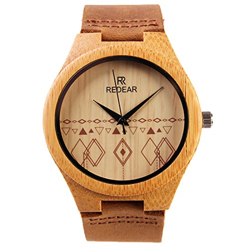 -. Feature : UNIQUE BAMBOO WATCH: The bamboo watches are gaining in popularity for it looks pretty posh and stylish! Made of natural materials with rare woods. The strap is made of matching leather. Leather and wood looks amazing together! If you love outdoors and nature, so being in the city and indoors most days, you can simply look down at your watch and see a bit of nature. You will feel like whenever you are wearing it, you are closer to nature. / HIGH QUALITY AND LIGHT WEIGHT WOODEN WATCH: Every detail, from the fashionable face and comfortable band, down to the engraved reverse side, adds a beautiful touch to the timepiece. The band is really comfy and soft. The clasp is highly polished and very sturdy . It is SO LIGHT, you may barely notice it on your hand, stays topside on your skinny wrist. The simple design and earth tones suit you perfectly. Overall excellent design and very sophisticated look, Very attractive. / JAPANESE QUARTZ MOVEMENT: The notches in the face work well for telling time. The large ones for the hour are easy to read. The hands of the watch move very smoothly and accurately. If you listen very closely in a quiet room, you might even hear the individual ticks. It's very crisp and has a lot of quality to it. No numbers on it, brings you the simplicity. / FITS FOR ALL OCCASSIONS: It is very light weight and comfortable to wear, perfect for casual wear and well made enough to wear to some more dressed up events as well. It will go with whatever you're wearing. Besides this, this watch is also water resistant which will be an added advantage. / TIGETHER WITH A LUXURY GIFT BOX: This will make a wonderful gift as it comes neatly packed in a nice box. It is a great little buy for yourself, and it's also a great gift for others! For a watch fanatic who always looking for unique watches, this is a wonderful watch collection.