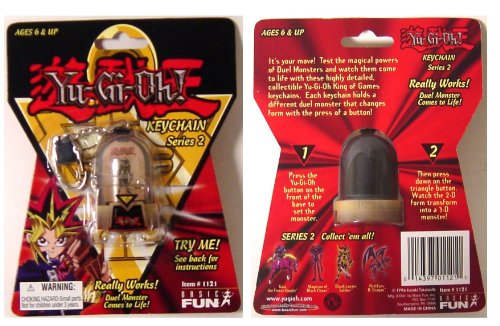 -. Binding : Toy -. Brand : Yu-Gi-Oh! -. EAN : 0014397011211 -. Feature : Each keychain holds a different duel monster that changes form with the press of a button. / There are four different figures. / These are sold AT RANDOM. / Brand new in manufacturer's packaging. -. IsAdultProduct : 0 -. Label : Basic Fun -. LegalDisclaimer : ages 6 yrs. + -. Manufacturer : Basic Fun -. MPN : HYU8X -. PackageQuantity : 1 -. PartNumber : HYU8X -. ProductGroup : Toy -. ProductTypeName : TOYS_AND_GAMES -. Publisher : Basic Fun -. Studio : Basic Fun -. Title : Yu-Gi-Oh Duel Monsters Keychains -. UPC : 014397011211