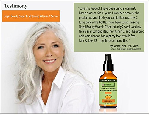 -. Binding : Misc. -. Brand : Joyal Beauty -. EAN : 0866906000021 -. Feature : ✔ This Formulation is superior due to use of a uniquely stabilized and effective STAY-C® 50+E+Ferulic. / ✔ Intensely lighten and whiten skin; Boost collagen; Increase elasticity and firmness; Fight wrinkles / ✔ Proven to reduce and restore sunburn cells to 96%. Fade sun spots and discoloration naturally / ✔ Vitamin C+E+Ferulic doubled photo-protection from 4-fold to 8-fold! Best skin protection AM and PM / ✔ Made in USA by FDA registered facility under strict GMP compliance. Paraben-free. Safest formula. -. IsAdultProduct : 0 -. Label : Joyal Beauty® -. Manufacturer : Joyal Beauty® -. Model : VCS1 -. MPN : VCS1 -. NumberOfItems : 48 -. PackageQuantity : 1 -. PartNumber : VCS1 -. ProductGroup : Beauty -. ProductTypeName : BEAUTY -. Publisher : Joyal Beauty® -. Size : 1oz -. Studio : Joyal Beauty® -. Title : #1 Top Rated The Best Organic Vitamin C Serum 20% for Face by Joyal Beauty. With Hyaluronic Acid 11%+Ferulic Acid+Vitamin E+Witch Hazel. Best For Anti-aging/Repair Sun Damage/Skin Firming/Even-Toned. -. UPC : 866906000021