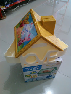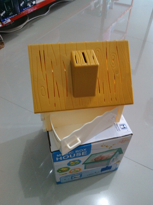 Pada bagian atap kotak musik ini terdapat dua bagian yang satu sebagai lubang yang bisa anda jadikan untuk celengan dan di bagian satunya bisa anda jadikan pigora untuk menaruh foto.