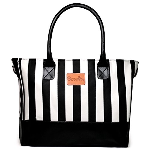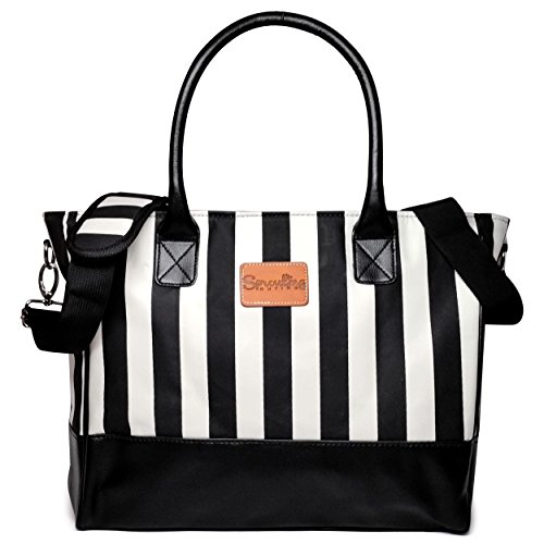 Designer Baby Diaper Bag from Sprouting Outing. Black Faux Leather Bottom and Handles and Black and White Stripes. Both Fashionable and Durable. Can be used as a Baby Diaper Bag or Tote Bag.