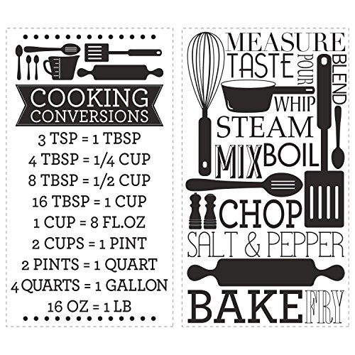 -. Binding : Tools & Home Improvement -. Brand : RoomMates -. Color : Black -. EAN : 0034878394893 -. Feature : Comes with 2 wall decals; decal range size 9.25"wide x 16.75"high to 9.25"wide x 16.75"high / Easy to apply - just peel and stick / Applies to any smooth surface / Decals are removable and repositionable with no sticky residue / Wall Decals made in the USA -. IsAutographed : 0 -. Label : RoomMates -. Manufacturer : RoomMates -. Model : RMK2745SCS -. MPN : 54133 -. NumberOfItems : 1 -. PackageQuantity : 1 -. PartNumber : 54133 -. ProductGroup : Home Improvement -. ProductTypeName : BUILDING_MATERIAL -. Publisher : RoomMates -. Studio : RoomMates -. Title : RoomMates RMK2745SCS Cooking Conversions Peel and Stick Wall Decals -. UPC : 034878394893