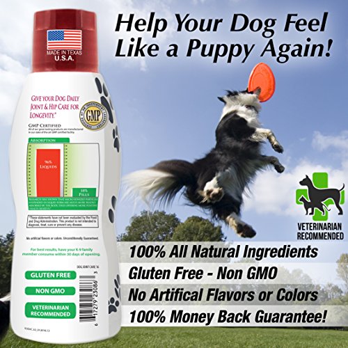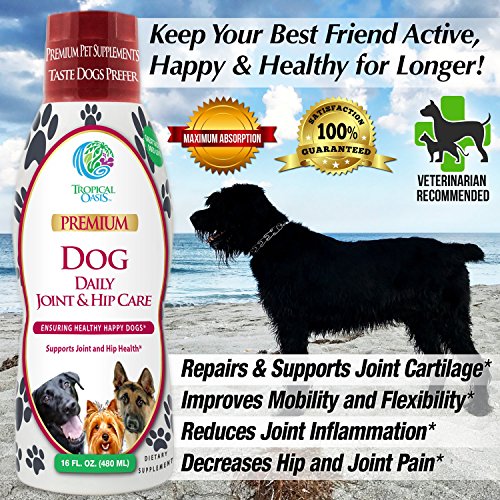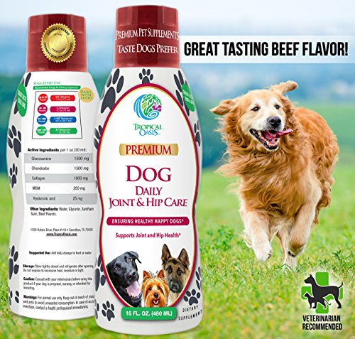 -. Feature : MAXIMUM STRENGTH HIP & JOINT SUPPORT: Our Advanced formula helps repair cartilage and improve joint function, reduce inflammation, improve mobility, and decrease hip and joint pain. / MAXIMUM ABSORPTION: Our liquid formula is absorbed up to 96% by the dog's body. Compared to pills/tablets that are absorbed about 5-18% by your dog's body. / ADVANCED FORMULA DEVELOPED BY VETERINARIANS - Containing 1500mg Glucosamine, 1500mg Chondroitin, 1000mg Collagen, 250mg MSM & 25mg Hyaluronic Acid. / NOW WITH 1000MG OF COLLAGEN: Collagen is shown to improve the level of elasticity in your dog's joints, tendons, cartilage, skin, and ligaments. Collagen is also the protein that determines the strength of your dog's hair, bones, nails, and teeth. / GREAT TASTE YOUR DOGS WILL LOVE- Great tasting beef flavor. All natural ingredients, no artificial flavors or colors. Non-GMO, Veterinarian Recommended. 100% SATISFACTION GUARANTEE- GMP Certified, Made in the U.S.A. in FDA Certified Facility