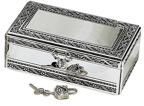 -. Feature : Crafted of fine silver plated material / Includes lock & key / Makes a great birthday gift / Different shapes and sizes available / Measures: 6" long x 4½" wide x 2½" high