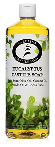 Liquid Castile Soap with great Eucalyptus Scent. Use for body wash, Shampoo, Shaving Cream, Laundry Detergent, Dish Soap and House Cleaning. Made from Organic, Vegan Ingredients.