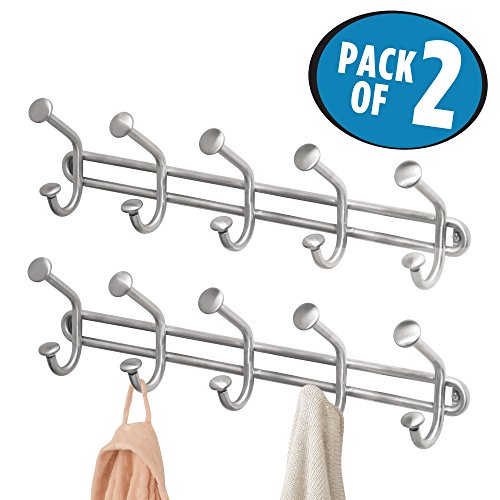 mDesign Wall Mount Storage Rack with 5 Double Hooks for Jackets, Hats and Scarves – Pack of 2, Stainless Steel