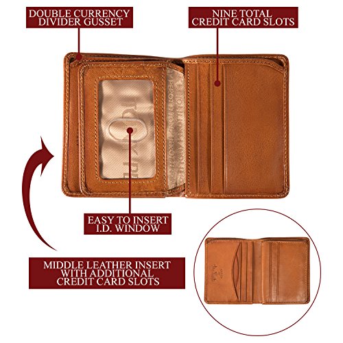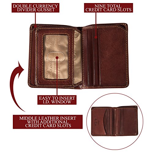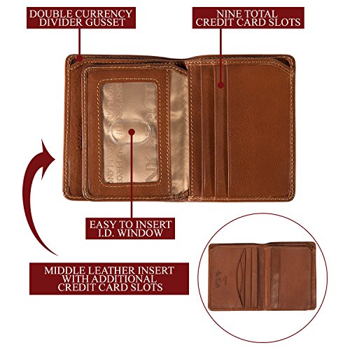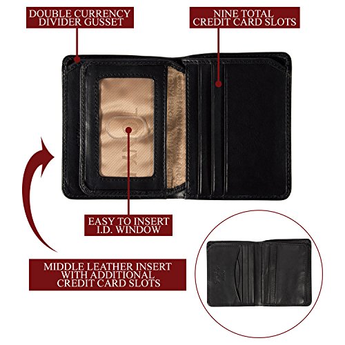 PRODUCT FEATURES: -Single Currency Divider Gusset -Nine credit card slots, two receipt pockets -A middle flap with ID window -Dimensions: 3.5"(L) x 4.25"(H) x 0.75"(W). Weight: 0.40lbs