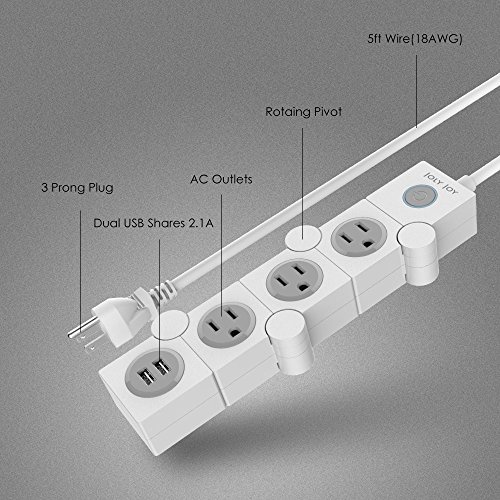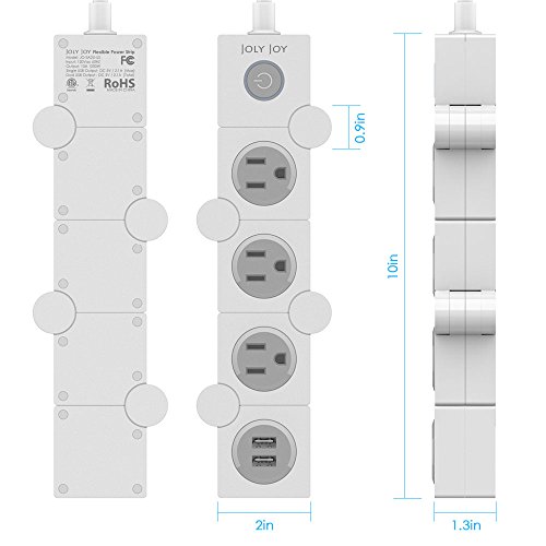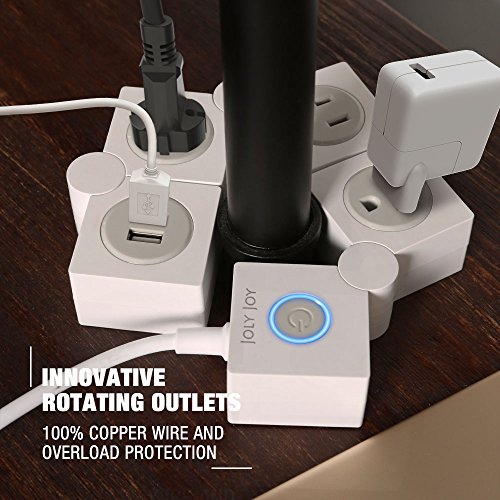 JolyJoy Flexible Power Strip with Patent Design, 3 Rotating Pivot Outlets, 2 Smart USB Ports, 5ft Long Extension Cord, Swivel Surge Protector with Multi Plugs (White)