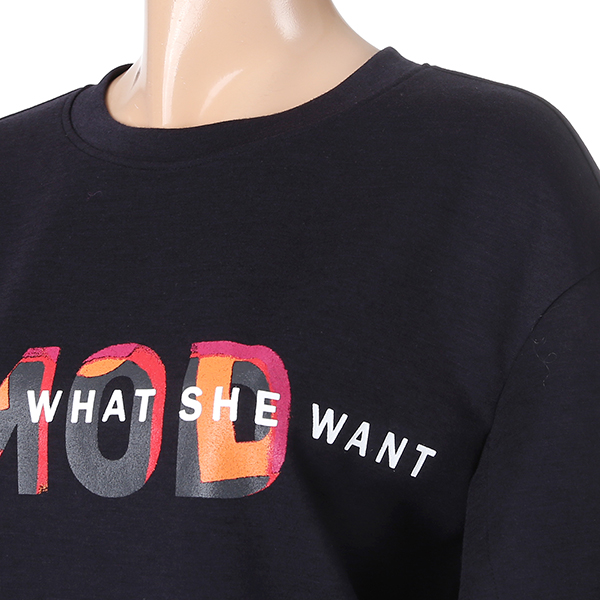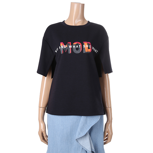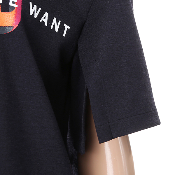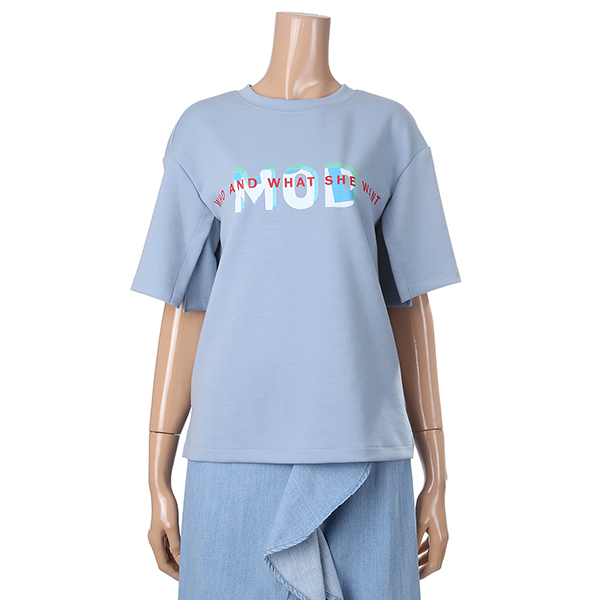 신축성 좋고 부드러운 소재로 소매 안쪽 트임디테일과 전면 레터링이 포인트 돼는 티셔츠 제품입니다