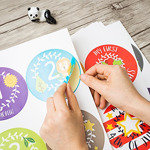 32 COLORFUL STICKERS FOR BABY BOYS: Boyish color and design scheme. Separated into 12 monthly stickers and 20 milestone stickers.