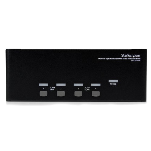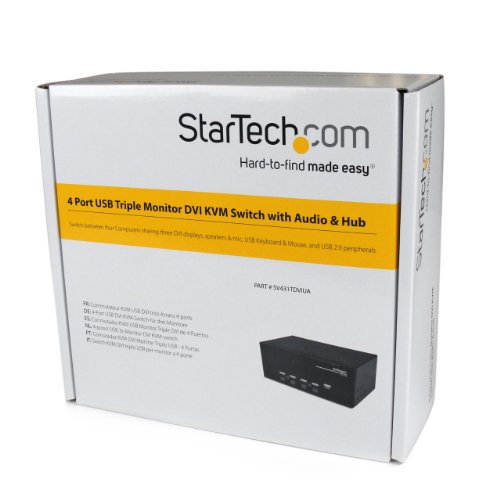 Switch between four triple head computers, while sharing three DVI displays, speakers & mic, USB Keyboard/Mouse, and USB 2.0 peripherals. The SV431TDVIUA 4-Port Triple Monitor DVI USB KVM Switch allows 4 PCs (each with 3 DVI video outputs) to share monitors, 1 microphone and set of speakers, 1 keyboard and 1 mouse, as well as an additional USB 2.0 peripheral such as an external hard drive, thumb drive, printer, or webcam. The Triple DVI KVM switch enables you to switch back and forth between 4 multi DVI PCs at the touch of a button, while maintaining professional-level video quality on all monitors at resolutions up to 1920x1200. The triple DVI KVM switch also features an integrated USB hub port which allows USB 2.0 peripherals to be shared between attached systems, eliminating duplicate peripheral costs and offering the convenience of sharing stored data between PCs. The SV431TDVIUA 4-Port Triple Monitor DVI KVM Switch is backed by a StarTech.com 3-year warranty and free lifetime technical support. Please note: While both DVI-I (analog mode) and DVI-D (digital only) are supported by the KVM, both source PCs must output the same signal type for proper switching. It is recommended, wherever possible, to use DVI-D cables across all PC to KVM and KVM to Console connections. If necessary, please contact our technical support team for assistance identifying your source.Feature
