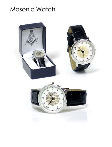 -. Feature : An elegant timepiece for Freemasons and collectors! / Stylish wristwatch features an embossed, gold-colored masonic square-and-compass design, stainless-steel watch backing, and a genuine leather textured black strap. / Comes beautifully gift boxed, making this a handsome addition to a Freemasonry collection display as well. / 1.5" diameter face. / 8" long band.