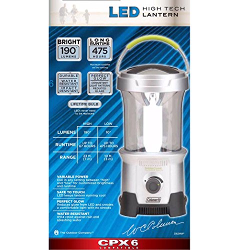 This lantern operates on four D batteries (sold separately) or one CPX 6 rechargeable power source, and the LED will never need to be replaced