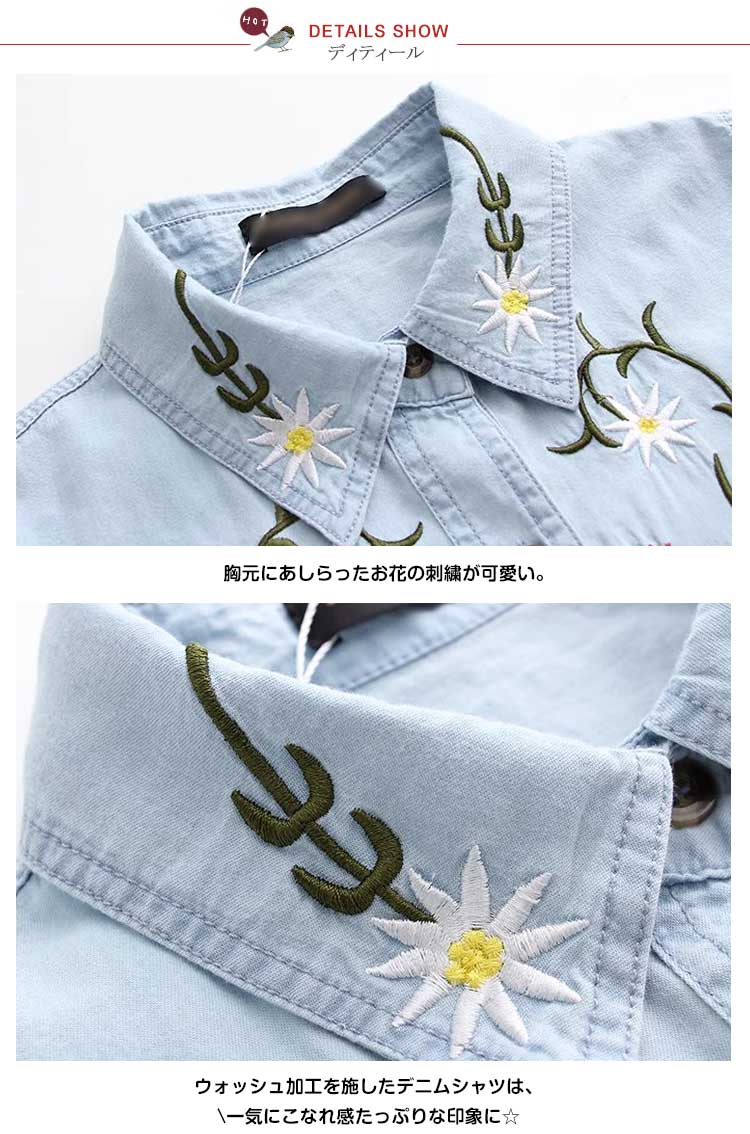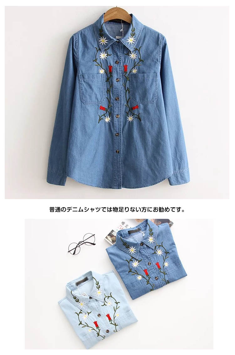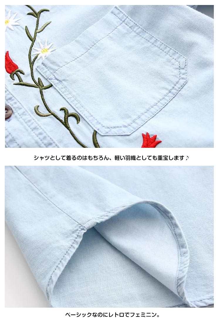 | 定番のデニムシャツに花柄刺繍を添えてグッとオシャレに、大人っぽく仕上たシャツ。カジュアルなデニムシャツをレトロ調に仕上げました。パンツにもスカートにも相性がいいので、コーディネートの幅が広がります。普通のデニムシャツでは物足りない方にお勧めです。 | |