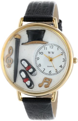 Amazon.com If you have a tap dancer in your life, then the Whimsical Watches Unisex Tap Dancing Black Skin Leather Watch #G0420007 is just what you're looking for. This fun and fanciful timepiece features a colorful tap dancing-themed scene alongside a circular white time display with gold-tone hands and Arabic numerals. Precise, high-quality Japanese quartz movement ensures time-keeping reliability, while the black, skin leather band offers a secure, comfortable fit. A gold-tone stainless steel bezel surrounds the 42-millimeter case and rounds out the details of a watch that every tap dancer is sure to love. This whimsical watch is water resistant to 100 feet (30 meters). 0