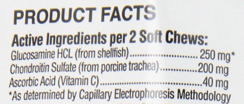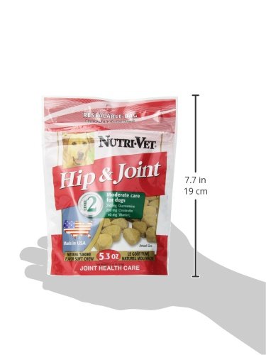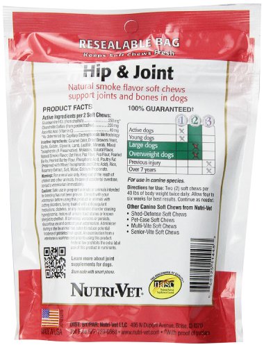 As dogs walk, run, jump and play, tremendous stress is placed on all components of ther joints. Years of wear and tear from exercise, normal aging, disease, injury or genetic conditions can break down cartilage, leading to instability and discomfort. Nutri-Vet bone and joint supplements are specifically formulated to support structural integrity of joints and connective tissues in dogs, and aspirin helps reduce pain in dogs of all ages, breeds and sizes. A proprietary blend of glucosamine, chondroitin and vitamin C promotes formation and repair of cartilage in elderly and active smaller dogs. Natural smoke flavor soft chew made WITHOUT BHA and propylene glycol.Feature