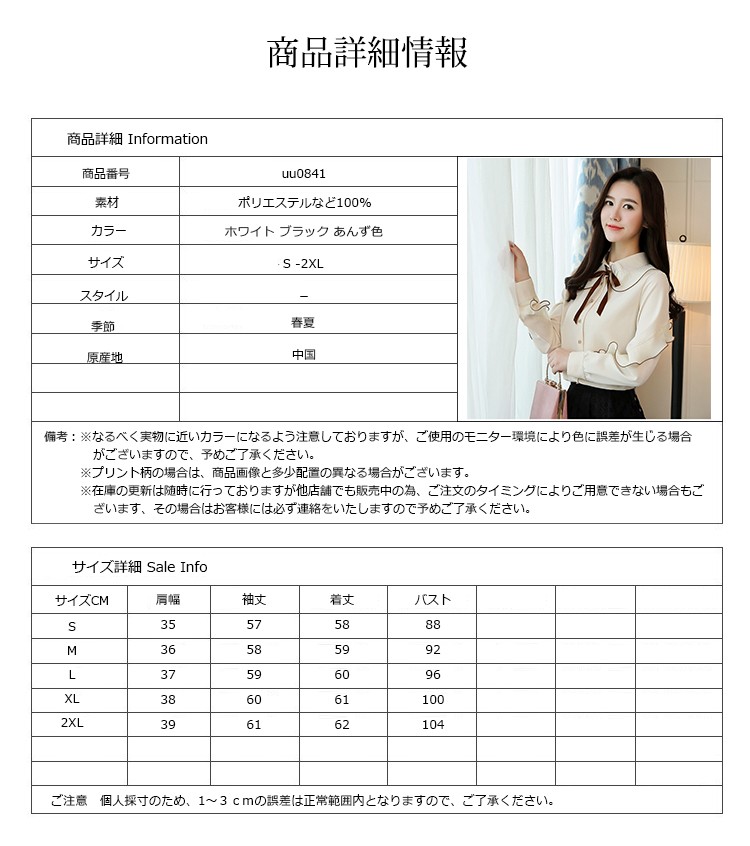 ■素材:ポリエステルなど100%■カラー:ホワイト ブラック あんず色 ■サイズ:S袖丈57着丈58バスト88肩幅35M袖丈58着丈59バスト92肩幅36L袖丈59着丈60バスト96肩幅37XL袖丈60着丈61バスト100肩幅382XL袖丈61着丈62バスト104肩幅39■原産地:中国
