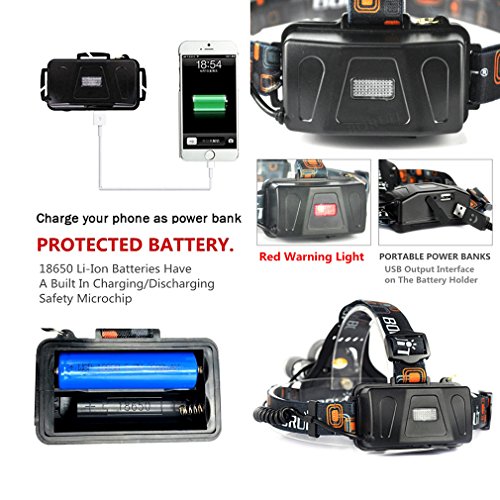 ● PORTABLE POWER BANKS:There is a DC input interface and a USB output interface on the battery holder,You can charge your mobile phone like a mobile power supply. Powered by 2 pieces of rechargable batteries (3.7v, 4400 mAh). Suitable for outdoor sport lovers to do some outdoor activities, such as hunting, cycling, climbing, camping, etc.waterproof and heatproof,Up to 6-15 hours working time under full charge. (4x2200 mAh Batteries=8800 mAh Battery Duration is 15 to 48 Hours.)
