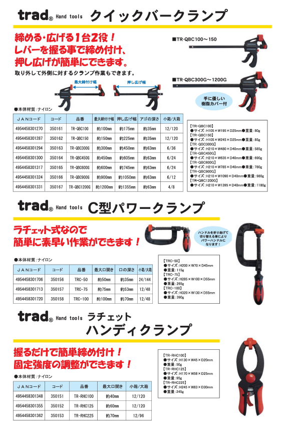 【商品名】 (業務用30セット)TRAD C型パワークランプ/ラチェット式締め具 【75mm】 本体材質:ナイロン TRC-75 〔業務用/DIY/日曜大工〕 【ジャンル・特徴】 ハンドルをパワーハンドルにも!素早い作業ができる作業工具 ■サイズ・色違い・関連商品■【75mm】 5セット■【75mm】 30セット[当ページ]■【100mm】 5セット■【100mm】 30セット■【50mm】 10セット■【50mm】 50セット ■商品内容 【ご注意事項】・この商品は下記内容×30セットでお届けします。ラチェット式なので簡単に素早い作業ができます!ハンドルを折り曲げて切り替えることによりパワーハンドルになります!■商品スペック●サイズ:H285×W100×D55mm●重量:265g●最大口開き:75mm●口の深さ:約53mm■送料・配送についての注意事項●本商品の出荷目安は【1 - 7営業日 ※土日・祝除く】となります。●お取り寄せ商品のため、稀にご注文入れ違い等により欠品・遅延となる場合がございます。●本商品は同梱区分【TS1】です。同梱区分が【TS1】と記載されていない他商品と同