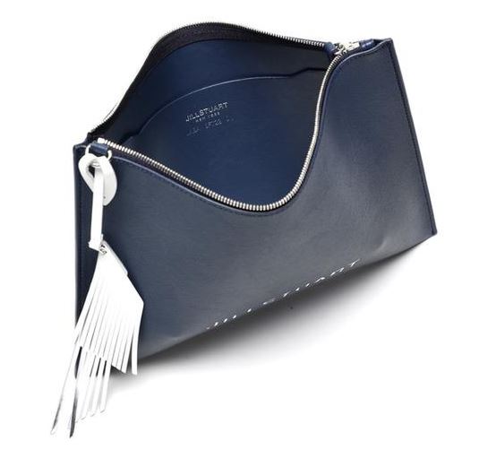 깔끔한 네이비 컬러에 독특한 배색 가죽 장식으로 포인트를 준 클러치 백 입니다.