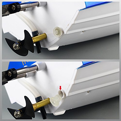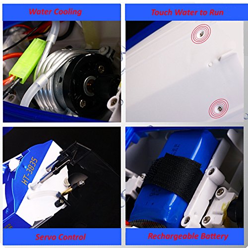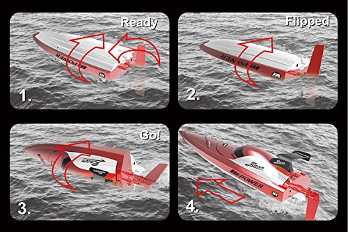 - "Touch water to run" Safety System, the boat will run when it touch the water - Low battery alarm remind the time of back to shore - Self-righting feature keeps the boat in play even if it capsizes - Three layer water resistant: outer cover, inner cover and parts cover - Full Function Radio Controlled: Forward, Backward Left and Right - 2.4Ghz spread spectrum technology: better anti-interference ability, faster reaction speed, least power consumption - 2.4Ghz technology allow more than 20 boats to run at the same time - Servo control Rudder, Trigger Transmitter with tuning - Water cooling system, 100% Metal Actuating Mechanism - Max Speed: 20 mph (30 kmph) - Max Control range: 450 feet (150 meter) - Powered by 380 Type Racing Motor - Professional Large Torsion Propeller - Hi-Capacity Rechargeable Battery: 7.4V 1500mah Li-ion - Up to 15 minutes playing time after 5 hours USB Charging - Instruction manual printed on the color box - After playing, remove the boat battery, open the cover, dry out the water - Factory Assembled and painted Ready To Run - Dimension: 19"L x 5"W x 5.5"H