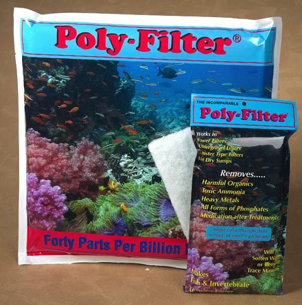The POLY-FILTER is for filtering and purifying both fresh and salt water aquariums. It is a formulation of a special patented material bonded to a synthetic matrix. By means of a unique proprietary process, the POLY-FILTER is made impervious to salt and is also organic loving to certain materials. It can absorb and adsorb contaminants and other toxic materials found in nature or added to fresh and salt water with or without fish and invertebrates. Medication added to fresh and salt water aquariums for treatment of diseased fish will automatically be removed by the POLY-FILTER after serving their intended purpose before the medication can produce a toxic effect on the fish.The POLY-FILTER is non-toxic and harmless to biological filtration because it allows a sufficient amount of ammonia to reach the biological filter in order to sustain the bacteria culture. The POLY-FILTER provides a supplemental means for removal of ammonia when the biological filter is unable to break down the excess ammonia and its concentration increases rapidly. Then the POLY-FILTER adsorbs the excess ammonia while the biological filter readjusts to higher ammonia input levels. Changes color when exhausted. 4" x 8".Poly-FilterOperating InstructionsFreshwater Application:Add Poly-Filter to any holder or apparatus at any time.Establishing Marine/Reef system:Add Poly-Filter so water can pass through it.For Maximum Filtration: Eliminate all water bypass.Poly-Filter in established marine freshwater systems: Conventional power filter: Place Poly-Filter on bottom plate. Cover with gravel or floss. Do not restrict flow. Plastic undergravel filters: Place Poly-Filter on top of the undergravel plate. Cover filter and plate with gravel. Canister-type power filters: Place Poly-Filter in the chemical filter compartment. Add floss according to manufacturer's instructions.Medication removal (parasite and antibiotic treatments):Remove Poly-Filter from water before any type of medication is added.Feature