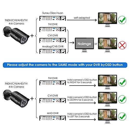 -. Feature : 2MP FULL HD 1080P 4-IN-1 SECURITY CAMERA - This 4-in-1 TVI/CVI/AHD/CVBS Bullet Camera. compatible with HD-TVI, AHD, CVI, and CVBS/960H analog DVRs. / 100FT NIGHT VISION - Built in 36pcs IR LEDs, IR 100ft/30m night vision,1980TVL ,3.6mm lens with IR CUT provide clear images, even in the dark. / INDOOR AND OUTDOOR USE - Aluminum Metal vandal proof & waterproof can withstand the toughest of outdoor conditions,3-Axis Camera Stand, cable through bracket. / 4 MODE VIDEO OUTPUT - 1080P AHD, 1080P CVI, 1080P TVI and CVBS. Default Video mode is 960H mode, compatible with all analog DVRs. 1080P video mode must be switched according to your 1080P DVR type. Widely Usage: With OSD button, you can change signal mode freely and quickly in 5 seconds. / NOTED&WARRANTY - This camera did not come with DVR. This camera comes with power supply &video power cable. Package comes with a One-year quality warranty, Lifetime Tech Support.
