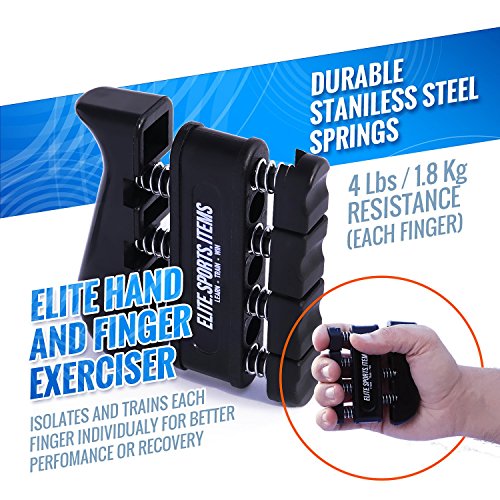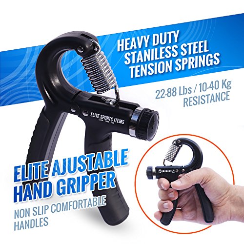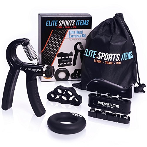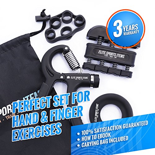 What included in our Elite Pack: 1 x adjustable hand grip strengthener 1 x hand strengthener grip ring 1 x finger exerciser 1 x finger stretcher resistance band 1 x carrying bag 1 x How to Ebook Becouse customer satisfaction is our highest priority we offer 3 YEARS WARRANTY. If you are not 100% satisfied with your hand exercise kit, we will happily refund in full. "Every product we create demands to be the best in his category, that's why we have created ESI (Elite Sports Items) brand, to bring quality into everyones life. We created ELITE SPORTS ITEMS so you can LEARN TRAIN WIN" - BOBO, Founder 0