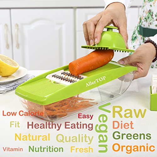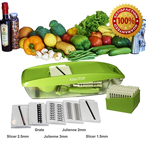 FOOD PREPARATION MADE EASY --- AllerTOP's 5 in 1 Mandoline Slicer is designed to cut and slice vegetables, fruits, cheeses, ham and sausages with minimal effort. All 5 interchangeable blades are made with the highest quality stainless steel. They are sharp, durable and will never rust.