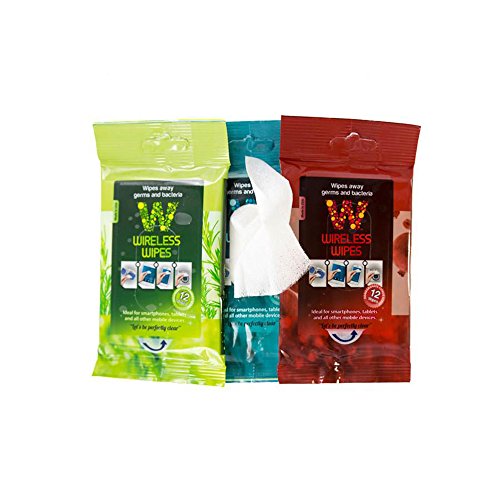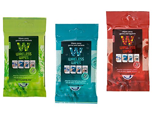 -. Feature : NO MORE DIRTY TALK WITH WIRELESS WIPES - We know three things: You use your mobile device day and night, they are covered with bacteria, and we need to keep you healthy by keeping your device clean! These wipes are especially important for parents, gym patrons, people in urban areas, and everyone during flu season. It's difficult to contain the spread of germs. Luckily there's Wireless Wipes, a quick, convenient, and safe solution for your health needs. It's a new day, wipe the slate clean! / COMPLETELY SAFE AND FULLY FUNCTIONAL - These wipes are damp, not wet, and feature a fast-drying action to avoid water damage. They will clean germs, grime, and smudges. Best of all, they're non-streaking and non-corrosive, meaning you can use them every day to have a clear, disinfected surface without damaging your phone. / WORKS FOR ALL MOBILE DEVICES, ELECTRONICS, AND MORE! - Our Wireless Wipes were specifically designed for use with cellphones and are perfect for iPhones, Androids, Windows Phones, Blackberries, and more. However, they're also ideal for iPods, ipads, E-readers, laptops, computers, monitors, television screens, as well as sunglasses, eyeglasses, or just about any surface you use on a regular basis. / AMERICAN BORN AND AMERICAN MADE - It all started when itchy red sores broke out on our founder's face and he was diagnosed with a staph infection. "How often do you clean your mobile device?" the doctor asked, "they're more infectious than a New York subway seat." In that instant, Wireless Wipes were born. They come in three appealing scents (green tea cucumber, rosemary peppermint and pomegranate citrus) and are still proudly made in the U.S.A. / SPECIFICATIONS: Kit includes (1) 12-pack of Pomegranate Citrus Wireless Wipes, (1) 12-pack of Rosemary Peppermint Wireless Wipes and (1) 12-pack of Green Tea Cucumber Wireless Wipes.