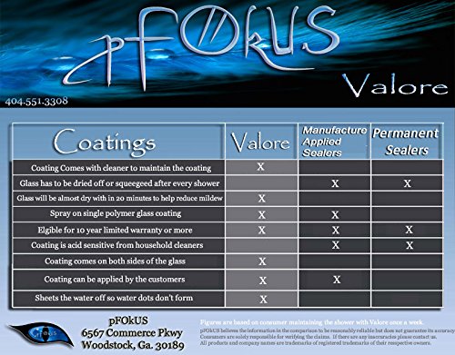 -. Brand : Valore Cleaner -. EAN : 0011711369096 -. Feature : Spray Valore on your shower glass every 2-3 weeks and no water dots will etch your glass / Valore will sheet water off your glass and dry dot free / No More Squeegeeing Glass Again / Only spray and wipe down if soil is present or spray and walk away and shower within seconds / 2-10oz aluminum spray bottles -. Label : pFokus -. Manufacturer : pFokus -. Model : Valore -. PackageQuantity : 1 -. ProductGroup : Home Improvement -. ProductTypeName : PLUMBING_FIXTURE -. Publisher : pFokus -. Size : 2-8 oz -. Studio : pFokus -. Title : Valore - Shower Glass Cleaner & Sealer to Prevent Water Dots 2-10oz bottles & 1-sprayer. Free Shipping over $50 -. UPC : 011711369096