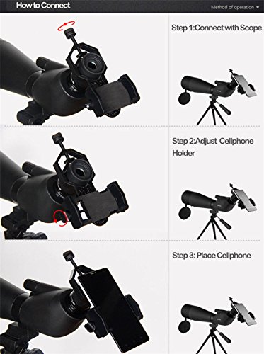 Studio : China OEM Publisher : China OEM Binding : Electronics Product Description Features: 1、Compatible with binocular,monocular,spotting scope,microscope,whose eyepiece diameter is between 25-48mm.With super large width range 55-100mm,fit? iphone 7plus 7 6plus 6 5s 5,Samsung Note and many other brands. 2、Adjustable Clamping Force.The phone clamping part features adjustable locking mechanism with a steel bolt (not a spring).This part can separately mounts on any standard tripod (1/4-20). 3、EVA Pads - Phone is well protected by high density EVA pads.Keep your device from scratch and damage. 4、Durable Metal Materials - Mainly made of aluminum alloy,fully metal housing. Phone clamp is made of high strength PA Plastic.One purchase for long-term use. 5、Compact and lightweight.Convenient to carry and easy operation.