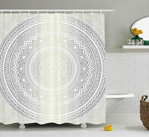 Grey and White Shower Curtain by Ambesonne, Medallion Pattern Round Shape Mandala Hippie Ombre Retro Culture Design, Fabric Bathroom Decor Set with Hooks, 84 Inches Extra Long, Grey White