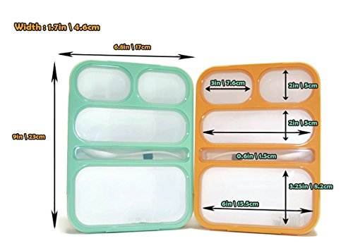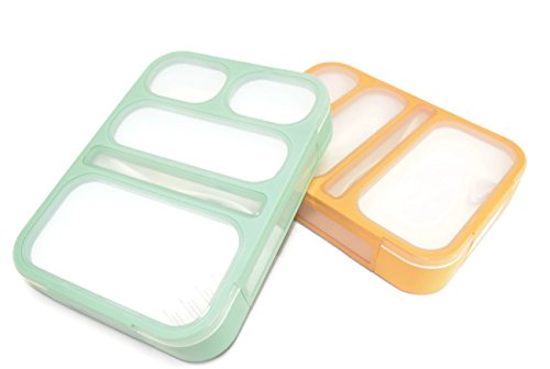 Set Of 2 Boxes 1 Green Mint And 1 Orange In a Price Of 1! PERFECT FOR LUNCHES, DINNERS, TRAVEL, PICNICS and much more. Now you can take home cooked meals and special entrees with the ultimate Bento Lunch Box for food preparation. It has 5 well-proportioned compartments and comes with a handy white spork. MADE WITH SUPERIOR SECONDARY INJECTION MOLDING TECHNOLOGY that allows for much more precise fits and construction. No wonder these lids snap on tight and won't leak. Turn your lunch upside down and sideways. Then shake it vigorously. Notice how NO liquid or juices drip out. You can set this on your fine cloth car seats or put them in your expensive designer purse without any fear of an accident. THE 1000 ML SIDES makes this food container ultra durable. The materials are completely safe for both adults and children. It is entirely BPA FREE and approved by the U.S. Food and Drug Administration (FDA) which is the most trusted consumer safety agency in the world. This lunch box is freezer friendly and designed especially for daily use in the microwave. Now you can take your favorite foods to work and heat them in the break room microwave without fear of scorching, melting, bending, or warping. Will not flavor food. TPR PLASTIC SEAL GUM is used rather than silicone like other lunch boxes use. Why? Because our seal gum design gives you a much more secure seal. HOW TO SEAL THE BOX quickly and easily. Place on a level surface, press down firmly on edges and center partitions until you hear a click. Then fold down and snap side fasteners. You're done! Many people are stocking up so they have a lunch box for everyone in the family. HURRY AND BUY NOW while our supplies are plentiful. These are selling very quickly. They make a thoughtful gift for friends, family, and co-workers. 0 |
